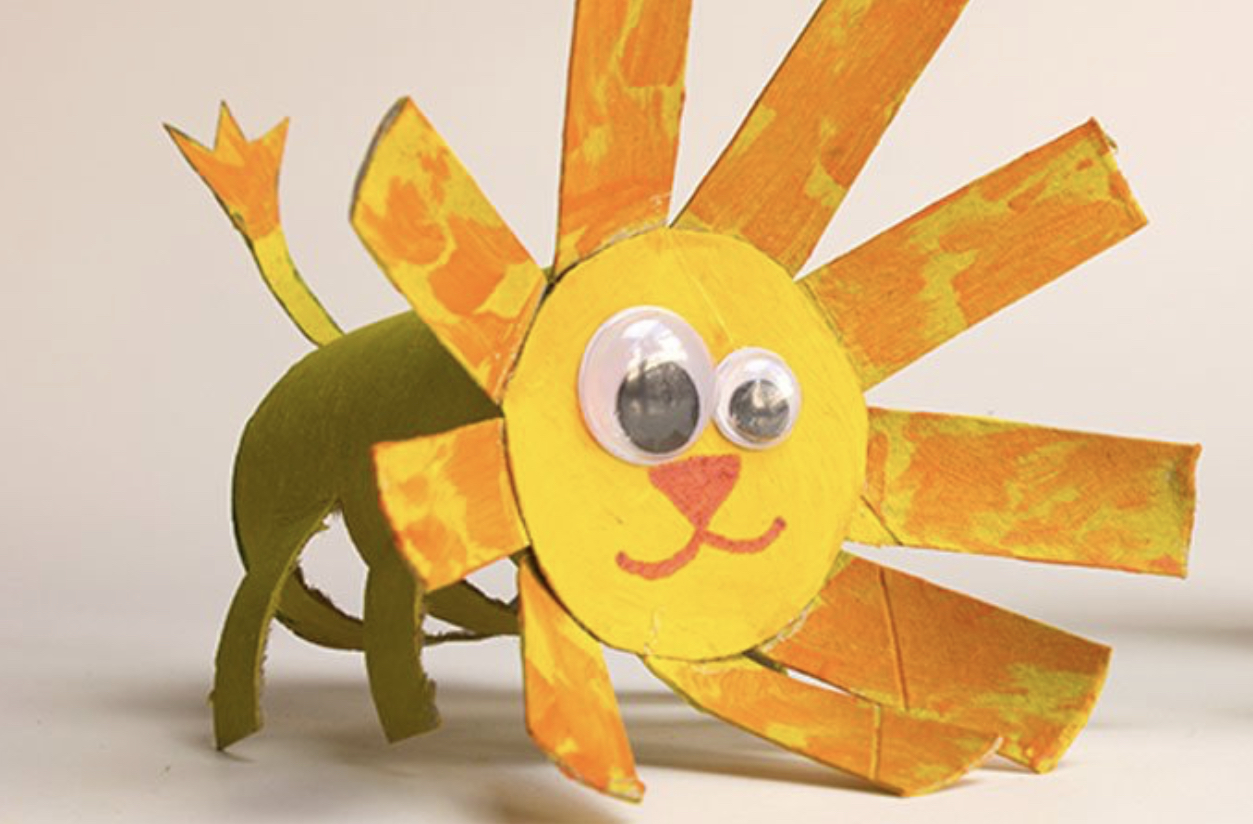 Para hacer al rey de la selva solo necesitas dos rollos de cartón de papel higiénico, pintura acrílica, ojos móviles (que si no los consigues puedes dibujarlos a mano), rotulador, pegamento de barra y unas tijeras.