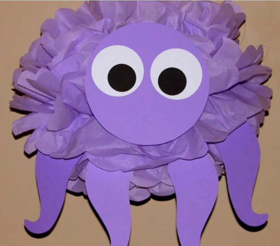En primer lugar apilamos las hojas y realizamos dobleces formando un acordeón. Con una regla aplanamos cada pliegue, para que así quede bien marcado. Ubicamos el centro a lo largo y atamos el papel con el alambre. Recorta los extremos para que tengan una forma redondeada, o en picos para lograr un efecto más enfadado. Después, con cuidado, separa cada hoja de papel para que así el pompón vaya tomando forma. Por último, dibuja en una cartulina la cara y las patas del pulpo, y listo.